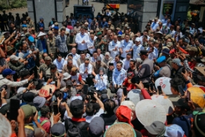 Jihan tak sungkan langsung duduk bersila di aspal. Diikuti Marindo dan pejabat lainnya.