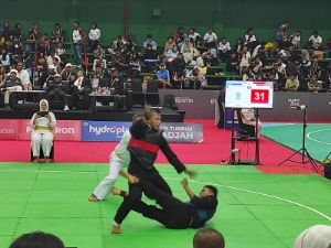 Hari ini, Muhammad Riski Tama menggapai kemenangan dengan nilai 42-9 atas lawannya Afri Chiba Hiroyuki dari Kalimantan Barat.