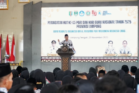 Hal tersebut disampaikan Gubernur saat menghadiri ramah-tamah usai Upacara HUT ke-80 PGRI dan Hari Guru Nasional 2025 tingkat Provinsi Lampung di Sesat Agung Nuwo Balak, Gunung Sugih, Lampung Tengah, Selasa, 25 November 2025.