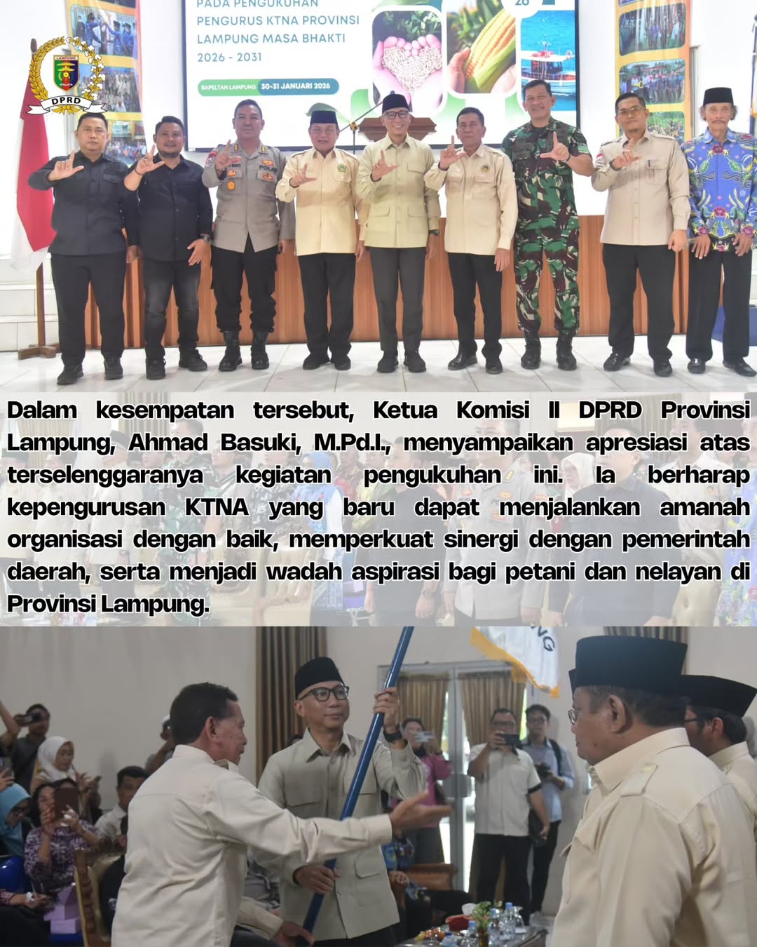 Bandar Lampung — Ketua Komisi II DPRD Provinsi Lampung, Ahmad Basuki, M.Pd.I., mewakili Ketua DPRD Provinsi Lampung, menghadiri kegiatan Pengukuhan Pengurus Kelompok Kontak Tani Nelayan Andalan (KTNA) Provinsi Lampung Masa Bhakti 2026–2031, Sabtu (31/1/2026).
