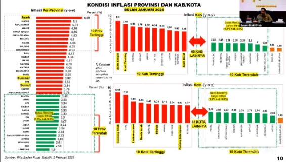 Meski demikian, Tito menekankan bahwa jika dilihat dari inflasi month to month, kondisi nasional justru menunjukkan deflasi dari 0,64 persen pada Desember menjadi -0,15 persen pada Januari, yang merupakan kabar baik karena menunjukkan harga barang dan jasa relatif terkendali. Penyumbang deflasi berasal dari kelompok makanan dan minuman (-1,03 persen) serta transportasi (-0,46 persen).