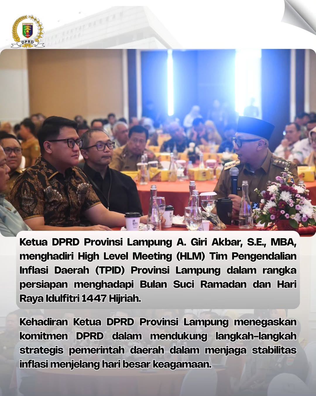 Bandar Lampung,-Ketua DPRD Provinsi Lampung A. Giri Akbar, S.E., MBA, menghadiri High Level Meeting (HLM) Tim Pengendalian Inflasi Daerah (TPID) Provinsi Lampung dalam rangka persiapan menghadapi Bulan Suci Ramadan dan Hari Raya Idulfitri 1447 Hijriah. Kegiatan ini berlangsung di Kantor Perwakilan Bank Indonesia Provinsi Lampung, Selasa (10/2/2026).