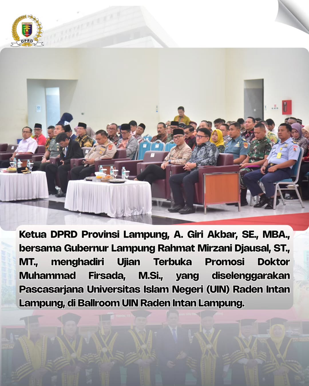 Bandar Lampung,-Ketua DPRD Provinsi Lampung, A. Giri Akbar, SE., MBA., bersama Gubernur Lampung Rahmat Mirzani Djausal, ST., MT., menghadiri Ujian Terbuka Promosi Doktor Muhammad Firsada, M.Si., yang diselenggarakan Pascasarjana Universitas Islam Negeri (UIN) Raden Intan Lampung, di Ballroom UIN Raden Intan Lampung. Kamis (12/02/2026),