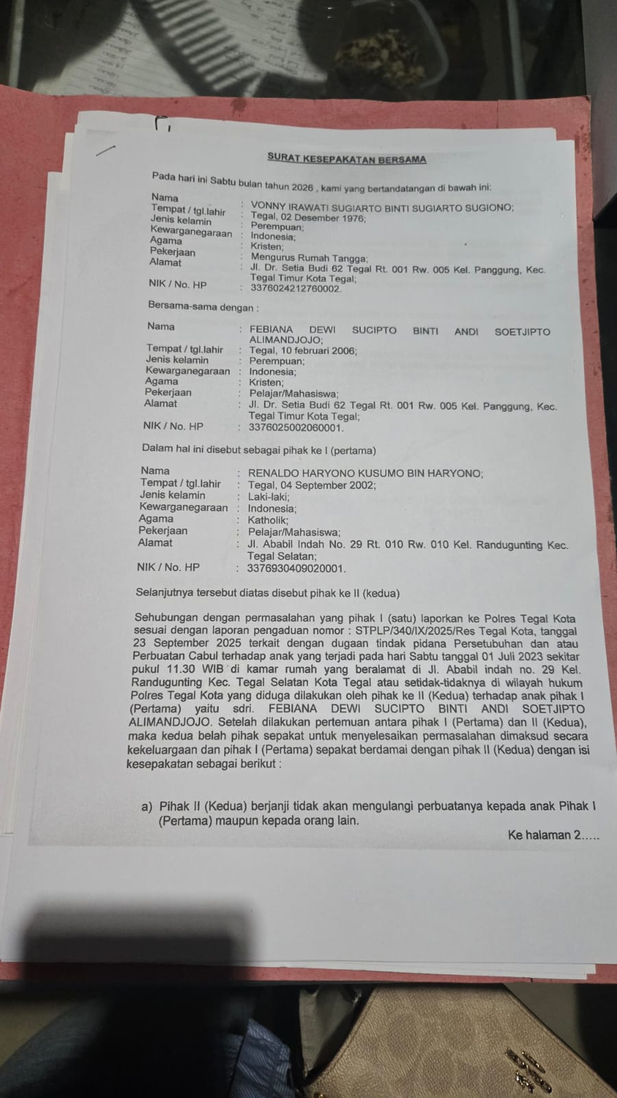 Seorang ibu rumah tangga, Vonny Irawati Sugianto, sebelumnya melaporkan seorang mahasiswa bernama Renaldo Haryono Kusumo alias Aldo ke Satreskrim Polres Tegal Kota. Laporan itu berkaitan dengan dugaan perbuatan tidak senonoh terhadap putrinya, Febiana Dewi Sucipto, yang saat kejadian masih berusia 17 tahun dan duduk di bangku kelas dua SMA.