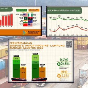 Ekspor Lampung Naik 16,16 Persen, Perdagangan Surplus US$462,11 Juta Berita Utama|10/01/2025oleh Cyber Indonesia Cyberindonesia.net – Neraca perdagangan Provinsi Lampung pada Agustus 2025 mencatat surplus sebesar